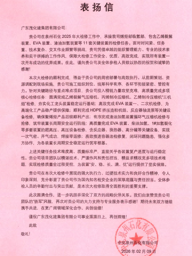 喜訊!茂化建收到泉州石化的表揚信