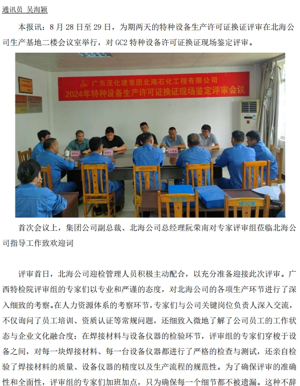 北海公司通過(guò)特種設(shè)備生產(chǎn)許可證(壓力管道)換證現(xiàn)場(chǎng)評(píng)審