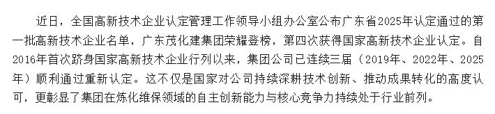 喜報 | 廣東茂化建集團再通過高新技術企業(yè)認定